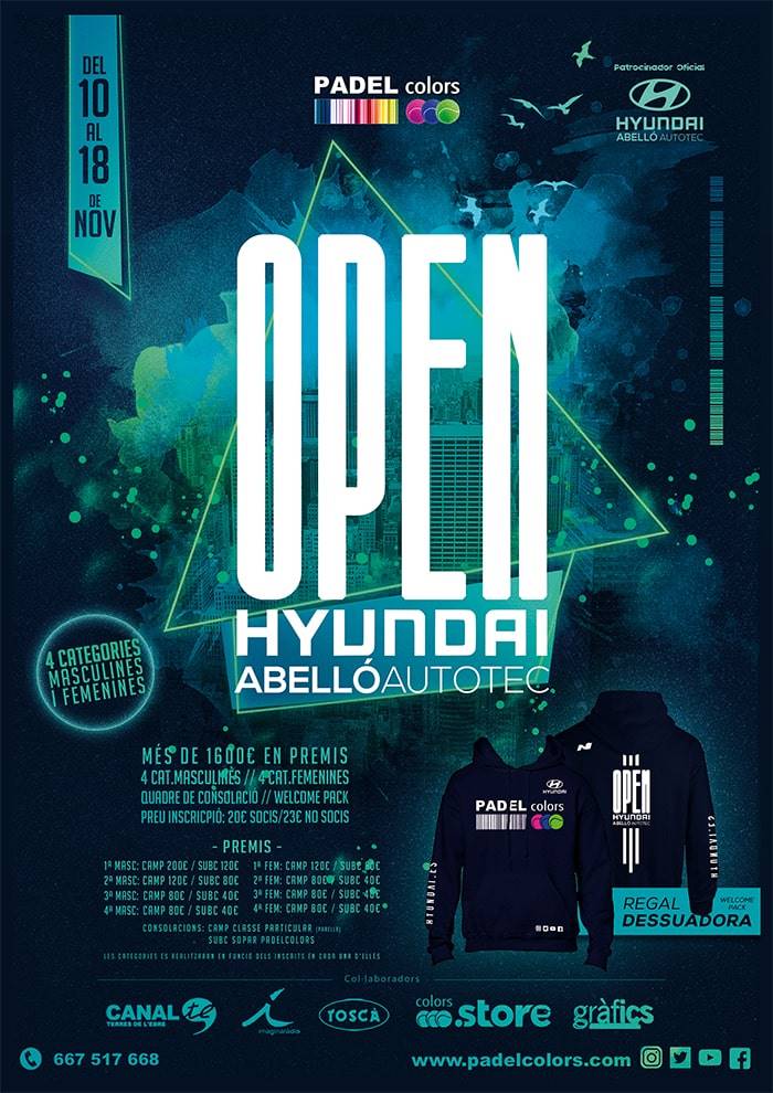 Ja tenim a tocar l'OPEN HYUNDAI Abelló Autotec del mes de Novembre. Del 10 al 18 un torneig dels grans, dels importants, dels que, entre moltes altres parelles, s'enfrontaran les millors duples del pàdel territorial. Un torneig dels que creen afició! Tot un espectacle!